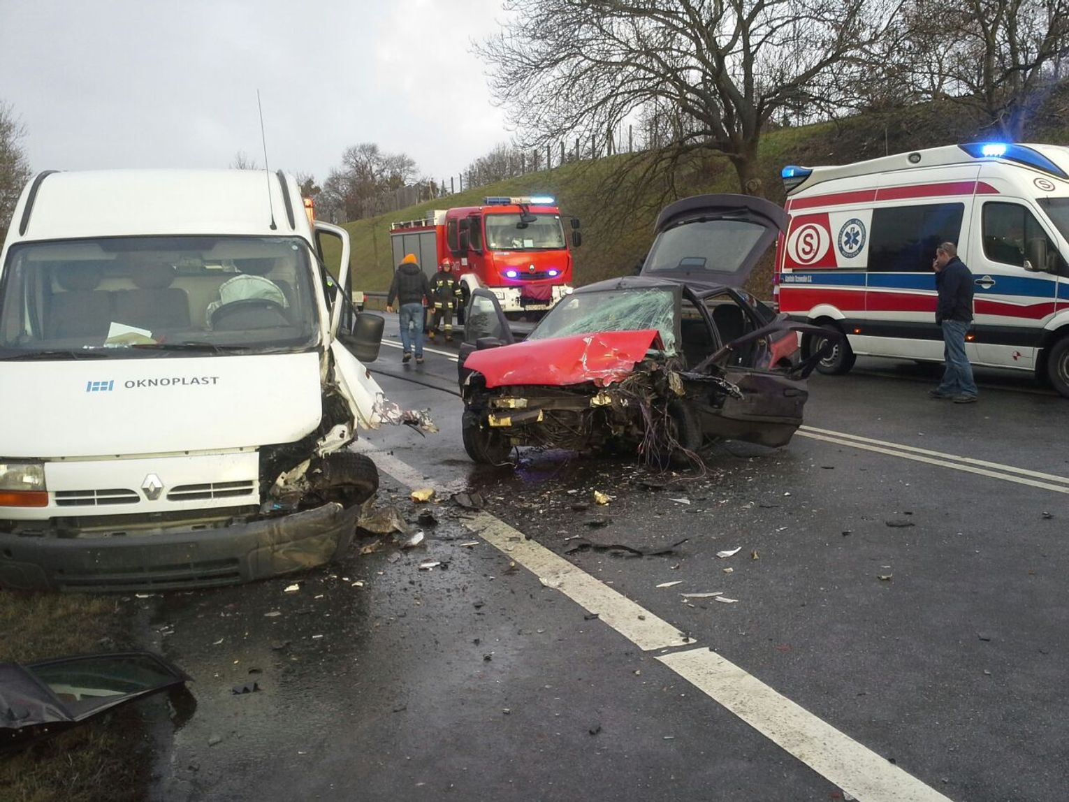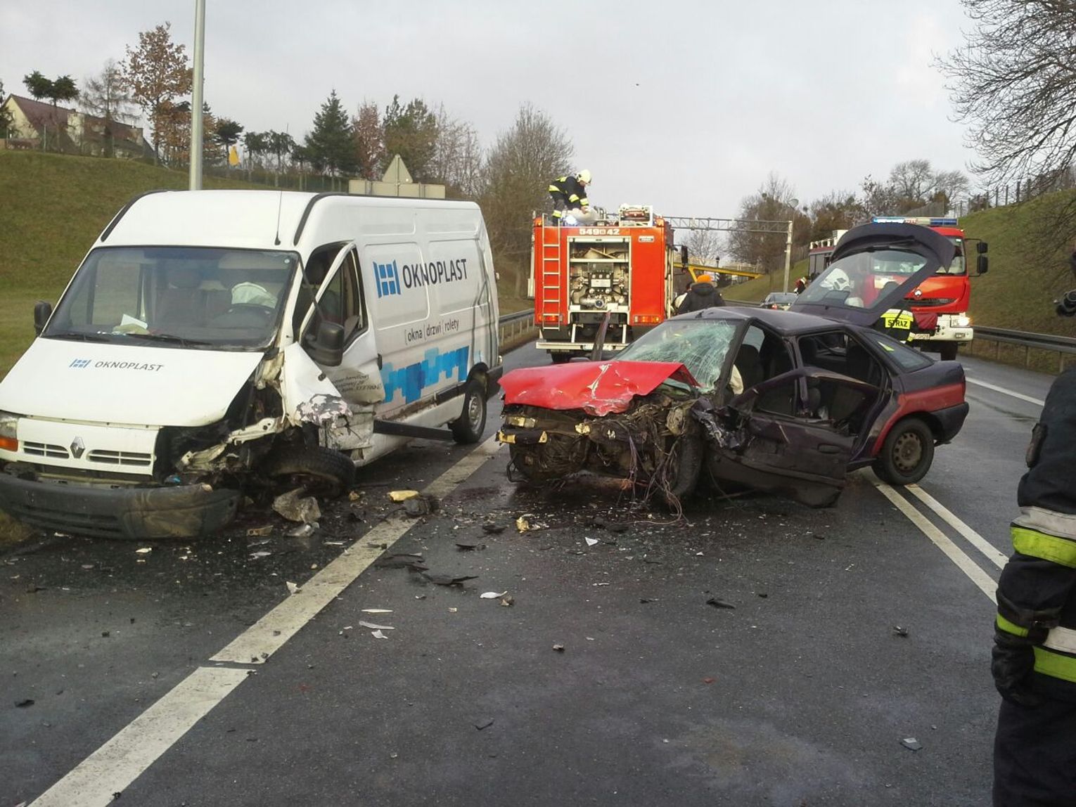Znacznie bardziej poważny wypadek wydarzył kilkadziesiąt minut później w Gniewie na krajowej „jedynce”, gdzie zderzyły się dwa auta: osobowy i dostawczy. Droga była całkowicie zablokowana. Nie obyło się bez osób rannych. Do wyciągnięcia kierowcy ze zmiażdżonej osobówki potrzeba było użycia narzędzi hydraulicznych. W sumie trzy osoby zostały zabrane do szpitala.