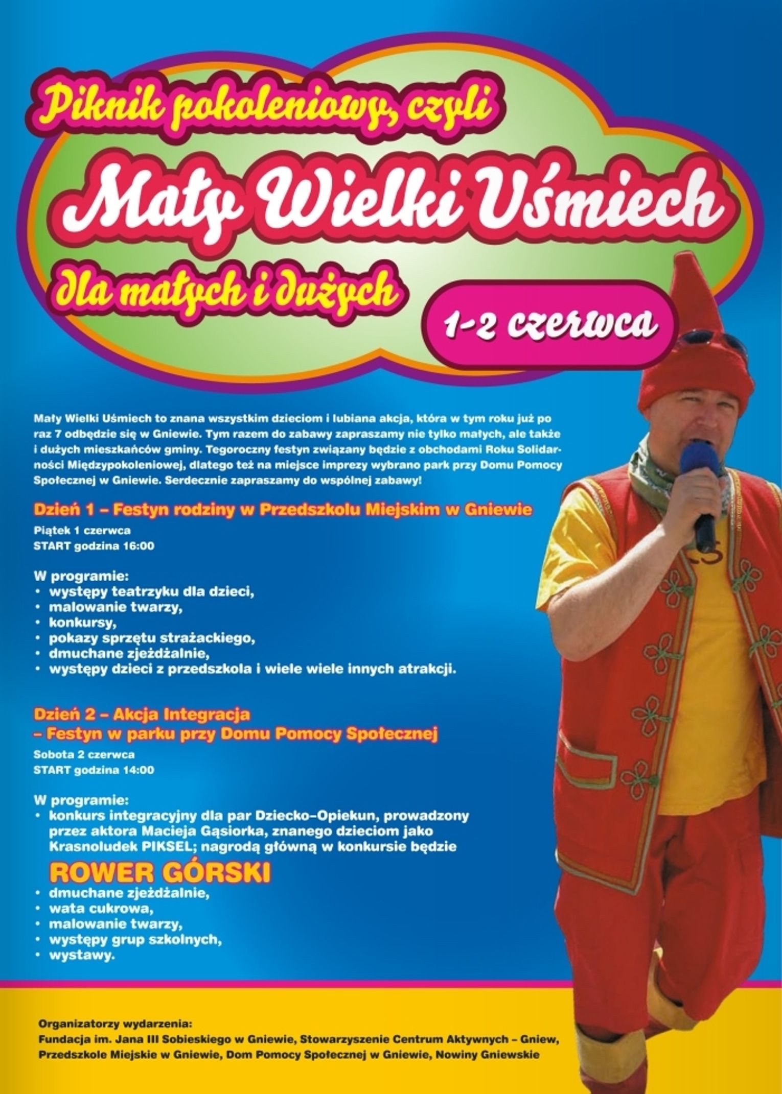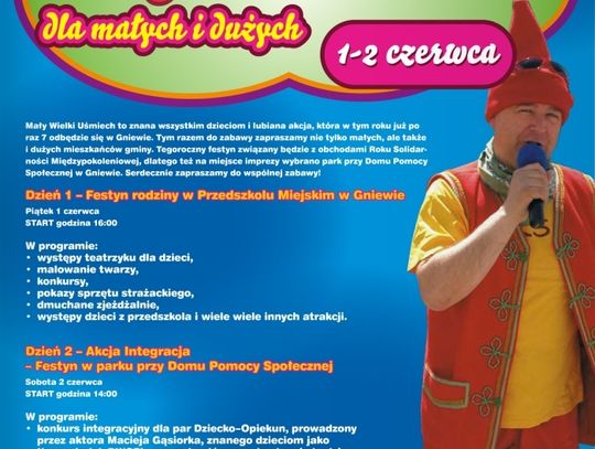 Dzień II – Akcja Integracja. Festyn w parku przy Domu Pomocy Społecznej, Sobota, 2 czerwca. Start o godz. 14.00. W programie: konkurs integracyjny dla par dziecko – opiekun, prowadzony przez aktora Macieja Gąsiorka, znanego dzieciom jako Krasnoludek Piksel; nagrodą główną w będzie rower górski, dmuchane zjeżdżalnie, wata cukrowa, malowanie twarzy, występy grup szkolnych, wystawy.