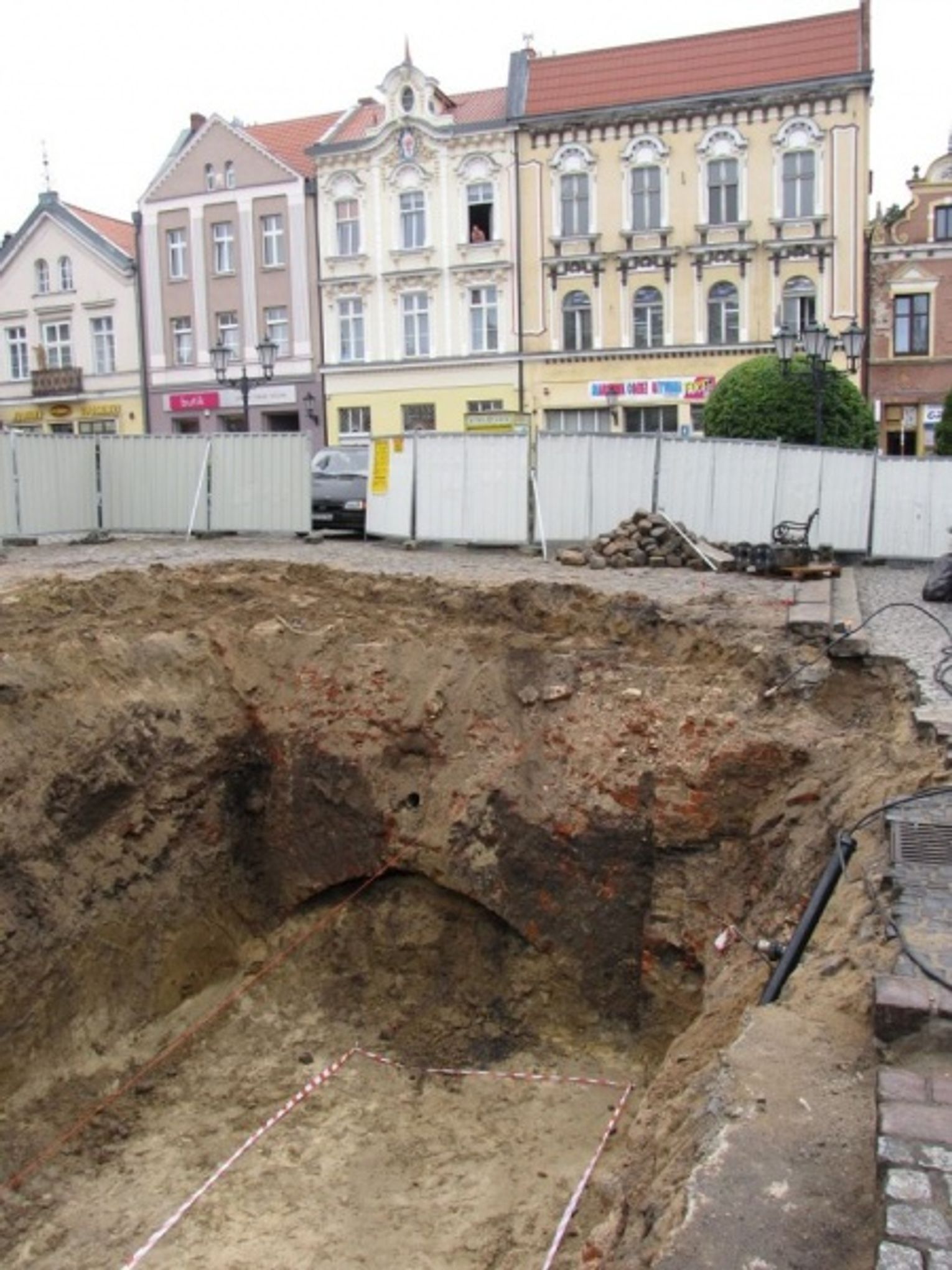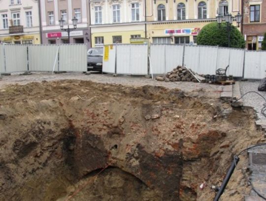 Przygotowując instalację nowego wodotrysku wykonawca prac wkopał się ponad cztery metry pod nawierzchnię rynku. W ostatni piątek pod zwałami ziemi odsłonięto mur o kamiennym fundamencie oraz ceglany łuk. Prace na czas badań archeologicznych zostały wstrzymane.
