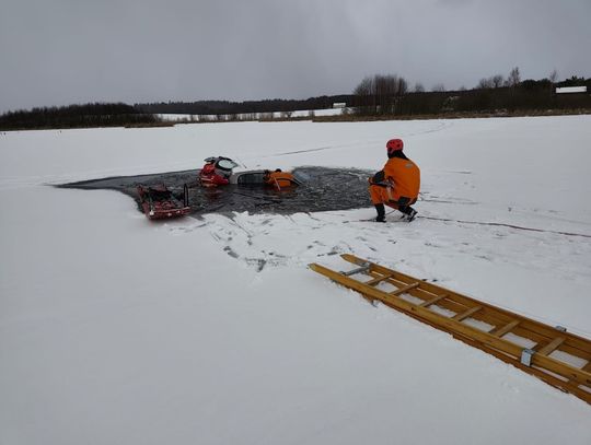 GM. TCZEW. 10 stycznia ok. godz. 10-tej w Szczerbięcinie doszło do nietypowej interwencji strażaków. Dwóch mężczyzn jeździło samochodem pod zamarzniętym jeziorze, gdy nagle lód się zapadł pod ciężarem pojazdu. Gdy strażacy przybyli z pomocą na miejsce, widoczny był tylko dach pojazdu. Zadysponowano 7 zastępów straży, w tym specjalistyczną jednostkę Wodno-Nurkową z Gdańska. Mężczyźni o własnych siłach wydostali się z auta oraz po lodzie na brzeg. Na miejscu interweniowała także policja i ekipa Zespołu Ratownictwa Medycznego. Na miejscu było 7 zastępów straży pożarnej