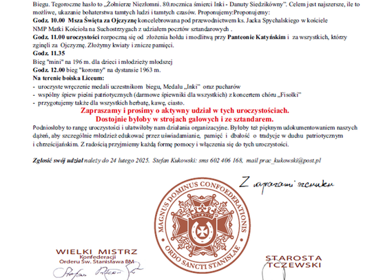 Organizatorzy zapraszają do aktywnego udziału w tych uroczystościach i zachęcają do odświętnego ubioru oraz udziału w apelu w strojach galowych i ze sztandarem.
