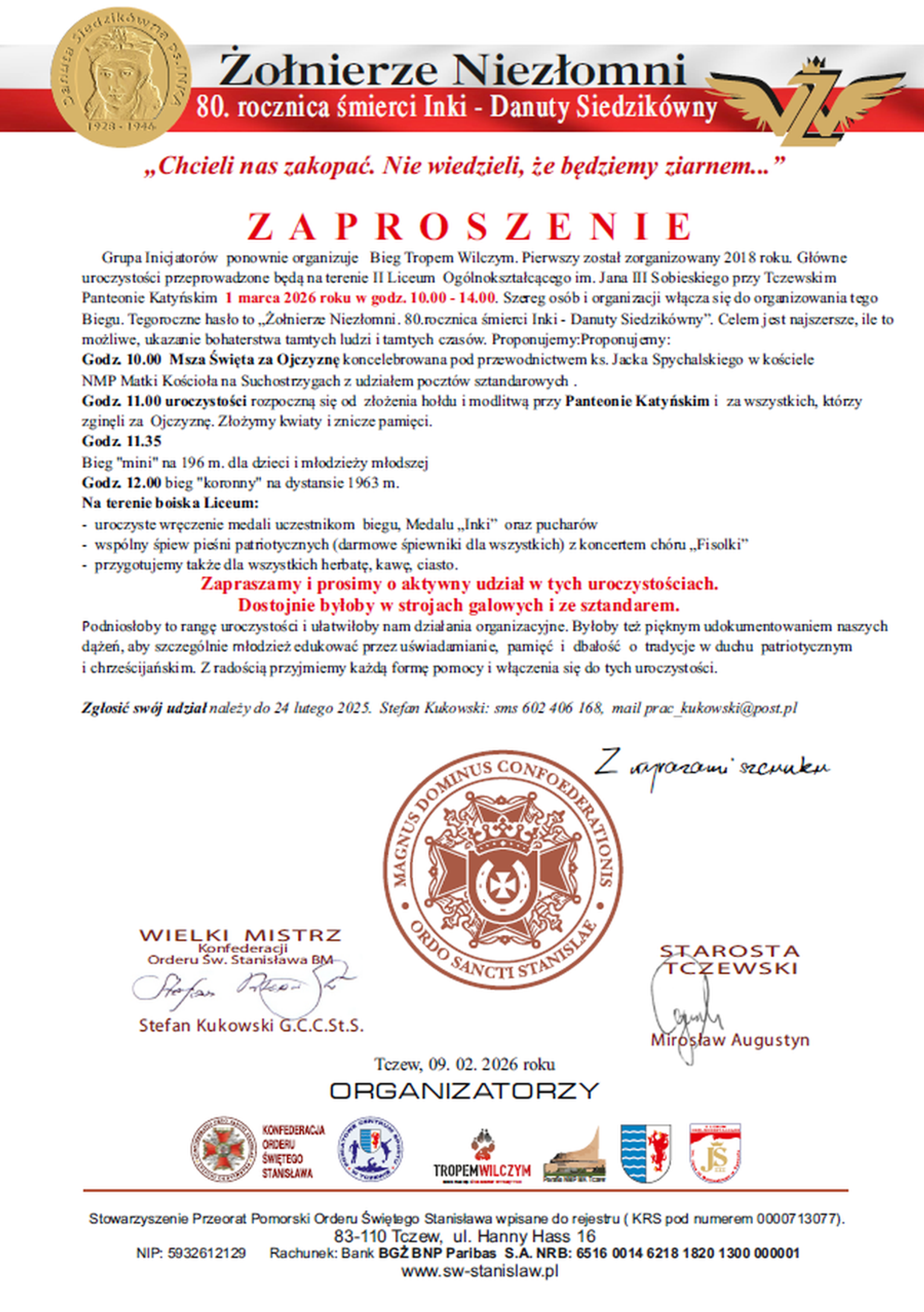 Impreza w Tczewie rozpocznie się tradycyjnie 1 marca 2026 r. w godz. 10.00 - 14.00. Szereg osób i organizacji włącza się do organizowania tego Biegu. Tegoroczne hasło to „Żołnierze Niezłomni. 80.rocznica śmierci Inki - Danuty Siedzikówny”. Celem jest najszersze, ile to możliwe, ukazanie bohaterstwa tamtych ludzi i tamtych czasów.