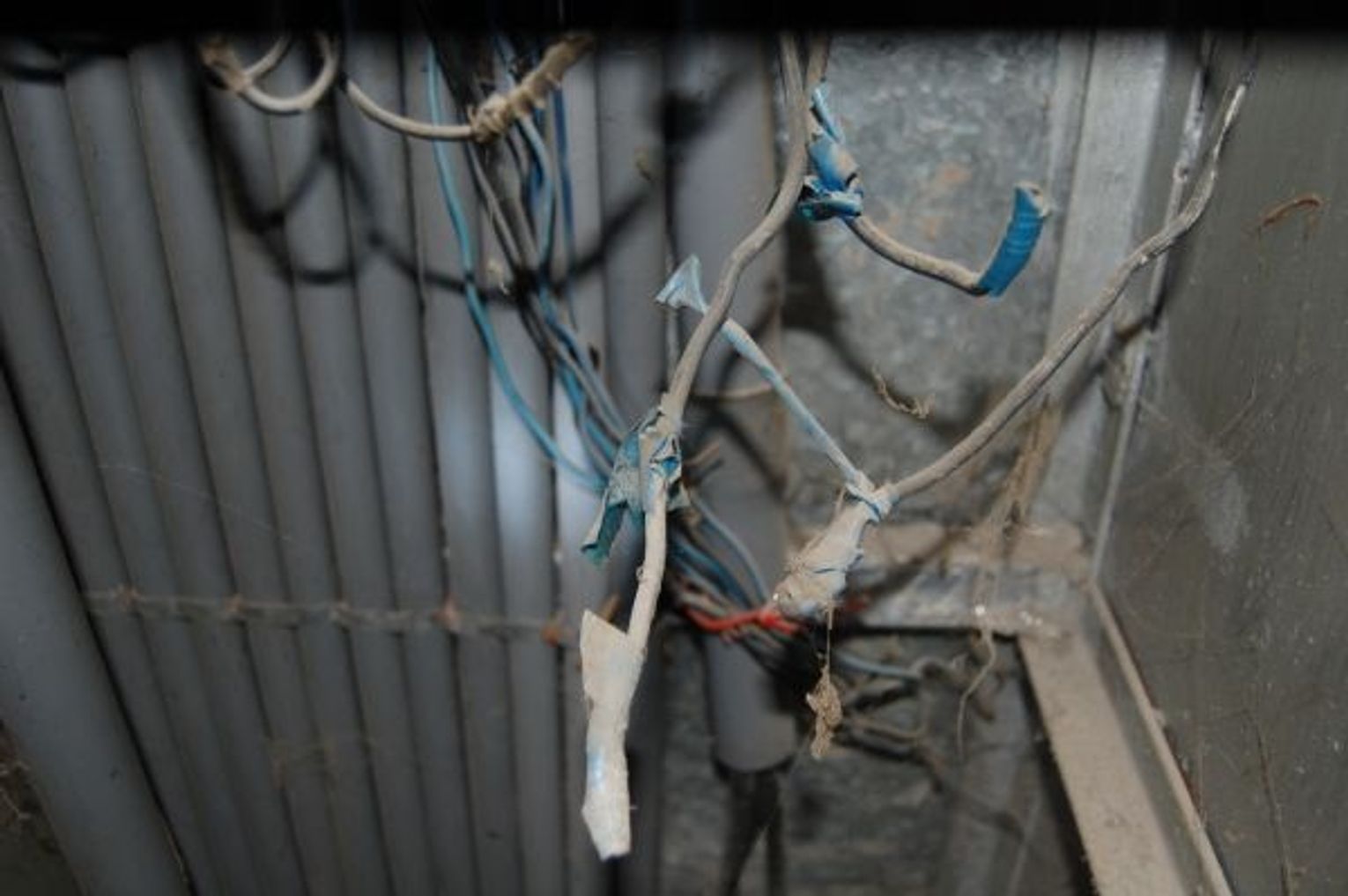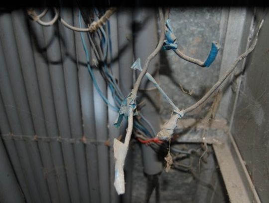 Nie bez powodu inspektor nadzoru „przyczepił” się do stanu przeciwpożarowego budynku. Główny zarzut dotyczył zagrożeń dotyczących sieci elektrycznej. Od tego, co zobaczyliśmy w mieszkaniach ludzi i na korytarzach, włos jeży się na głowie. Kable biegną pod cieknącym dachem korytarza bez żadnego zabezpieczenia. Tak samo jest w lokalach. Do tego w skrzynkach rozdzielczych widać plątaninę kabli pozawijanych tylko w antyizolacyjne osłonki.