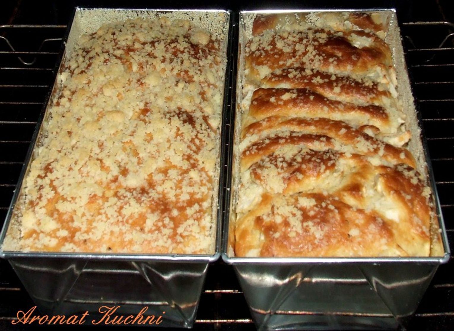 Tę drożdżówkę zazwyczaj rozrabiam wieczorem, a rano dodaję 1 kg mąki, 1 kostkę margaryny stopionej i ostudzonej, 3 łyżki oleju i rodzynki. Ciasto wylewam na dwie blaszki, robię kruszonkę i wkładam do pieczenia, na wierzch posypuję cukru pudru lub polewę.