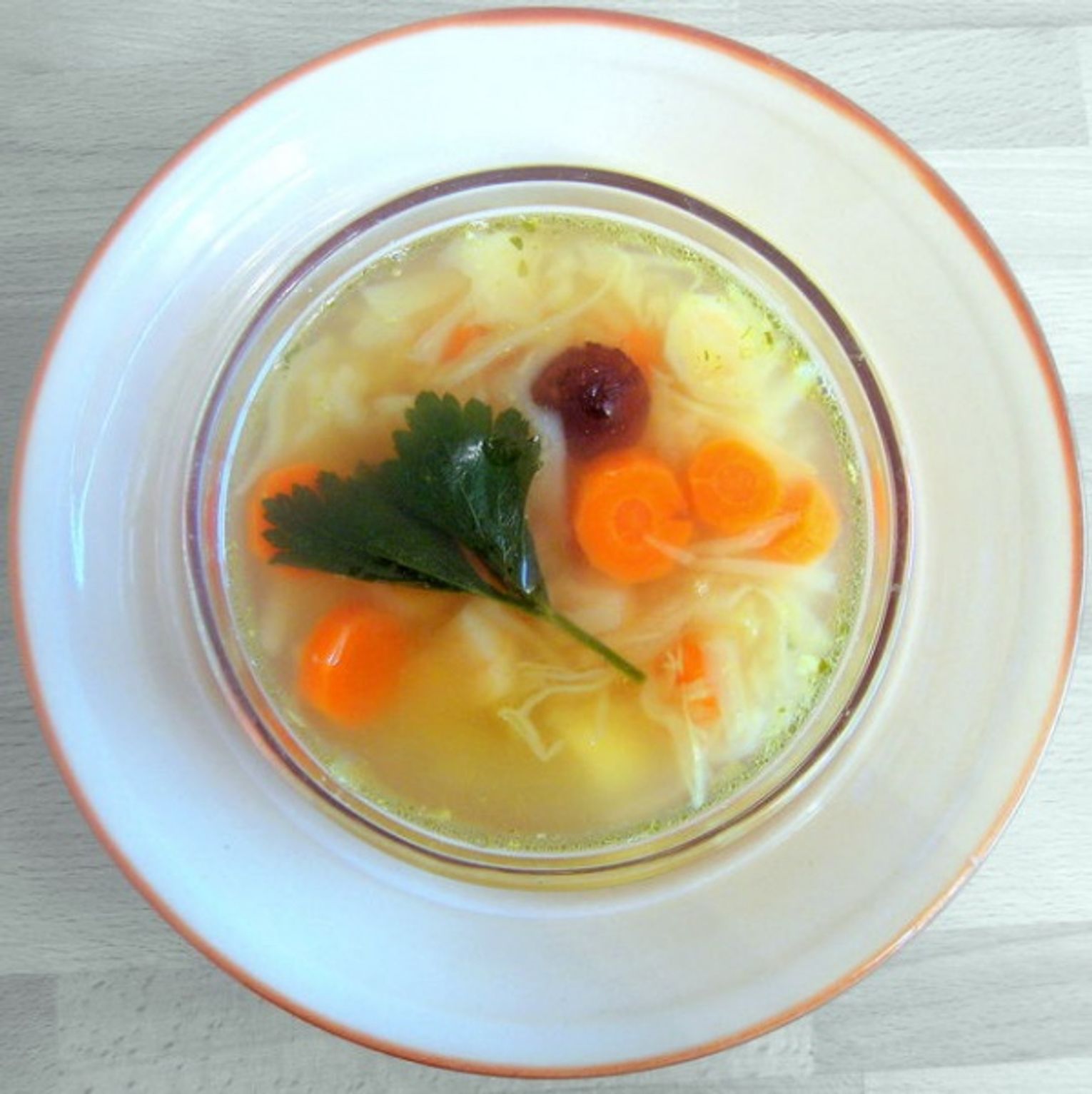 Zagotuj wodę z kośćmi drobiowymi, listkami laurowymi i zielem angielskim. Wrzuć kostkę rosołową. Kapustę obierz z wierzchnich liści. Pozbaw głąba. Umyj i poszatkuj ją drobno, a następnie dodaj do wywaru. Podgotuj 10-15 min. i dodaj pokrojone w talarki warzywa – marchewkę i pietruszkę oraz ziemniaki. Wrzuć grzybki i listki selera naciowego. Dopraw solą i pieprzem do smaku. Gotuj, aż wszystkie warzywa będą miękkie (ok. 20 min.). Będzie naprawdę pyszna!