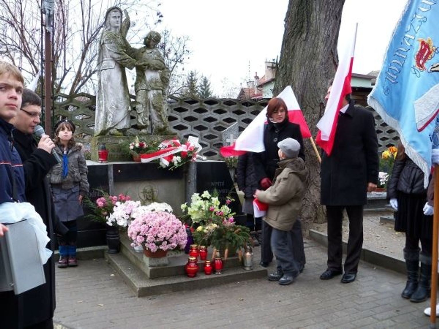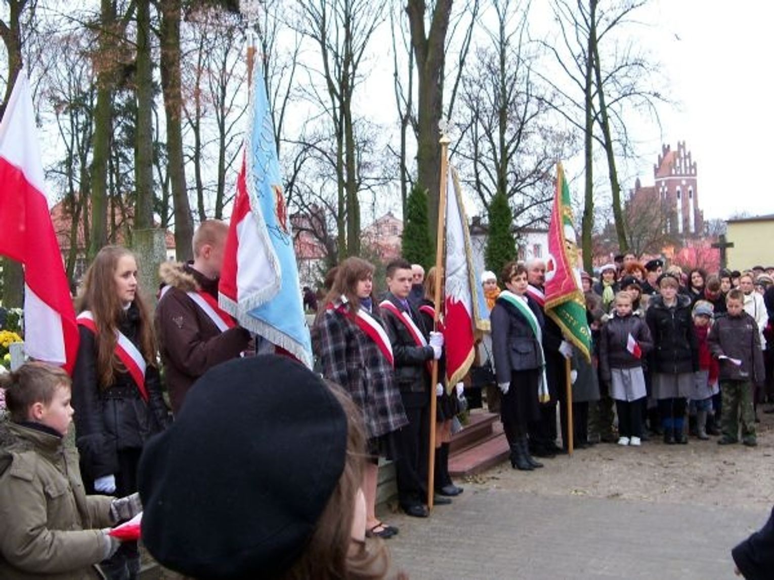 Po mszy św., przy dźwiękach orkiestry, jej uczestnicy przemaszerowali na pobliski cmentarz. Po odegraniu hymnu państwowego złożono wieńce i kwiaty oraz zapalono znicze pod obeliskiem. W imieniu władz samorządowych miasta i gminy kwiaty złożył wiceburmistrz Gniewa, Bogdan Olszewski. Były poczty sztandarowe, harcerze i zuchy, wielu mieszkańców. Ks. proboszcz wspomniał o potrzebie uporządkowania przez władze tego miejsca i pobliskich grobów legionistów, uczestników wojny polsko-bolszewickiej z 1920 r. Na cmentarzu jest siedem mogił żołnierzy, którzy walczyli o wolność Polski. Są na nich kwiaty i znicze, ale groby są zaniedbane. Nie ma też kostki na alejce prowadzącej do obeliska.