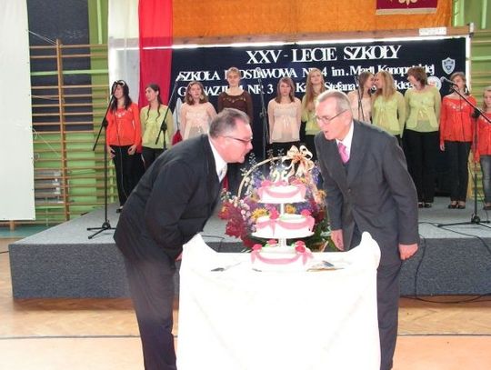 „Skały wietrzeją, człowiek się zmienia, lecz pozostają szkolne wspomnienia” – takie motto przyświecało 25-leciu szkoły, pięknemu jubileuszowi, który mogli świętować zarówno nauczyciele, teraźniejsi i byli uczniowie SP nr 4 oraz Gimnazjum nr 3. Wraz z nimi świętowali liczni zaproszeni goście, którzy... przynieśli ze sobą prezenty.