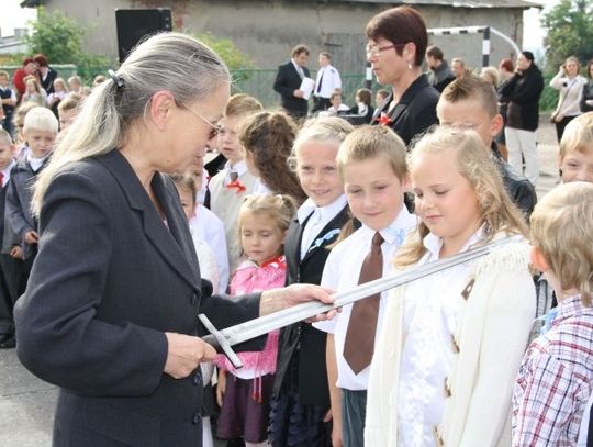 - Przyjmowanie dzieci w poczet pełnoprawnych uczniów ma u nas długą tradycję – mówi dyr. Hanna Sobierajska. – Już 17. rok pasujemy dzieci wg określonego scenariusza. Każdy pierwszak, w momencie kiedy przychodzi do szkoły, otrzymuje swojego opiekuna. Jest to uczeń starszej klasy – najczęściej V i VI. Po wielu latach okazało się, że ta funkcja opiekuna stała się sprawą prestiżową. Ale nie każdy uczeń może być opiekunem. Jest on starannie dobierany przez wychowawców z klas I i VI oraz pedagoga szkolnego. We wrześniu organizujemy wyjazd integracyjny w okolice Gniewu, gdzie odbywa się wspólna zabawa starszych uczniów z młodszymi.