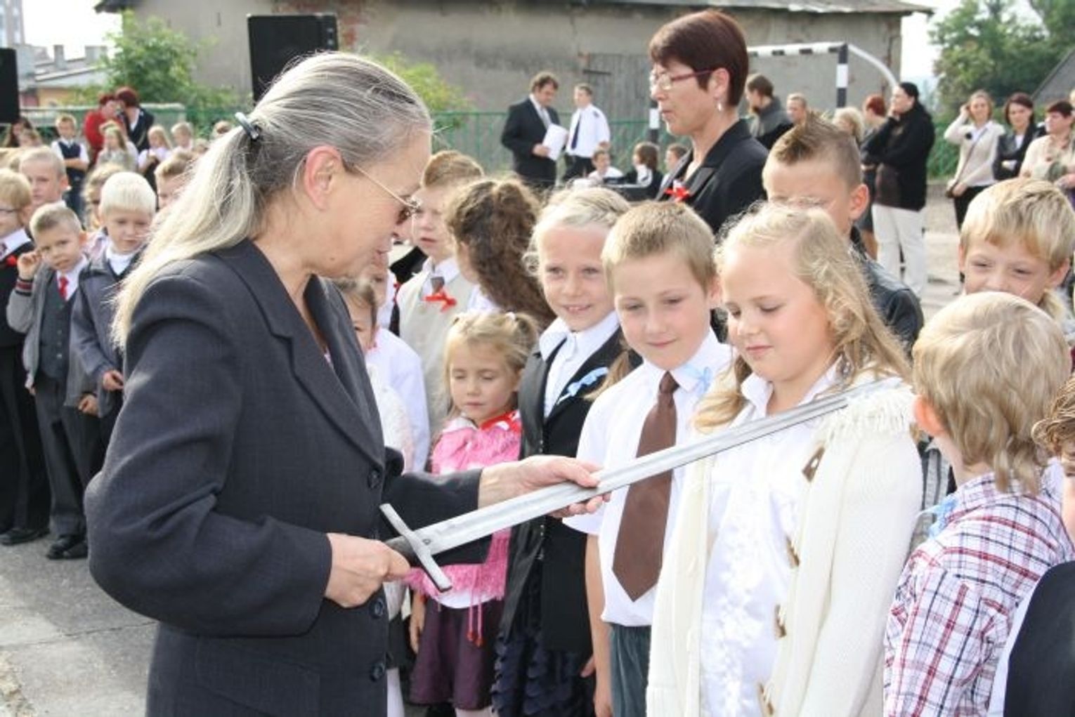- Pasowanie wielkim, średniowiecznym mieczem przyniesionym przez rycerzy z gniewskiego zamku jest od dawna tradycją w naszej podstawówce i niezmiennie budzi lekki strach u maluchów – relacjonuje Hanna Sobierajska. – Czasami nawet przymykają one oczy...
