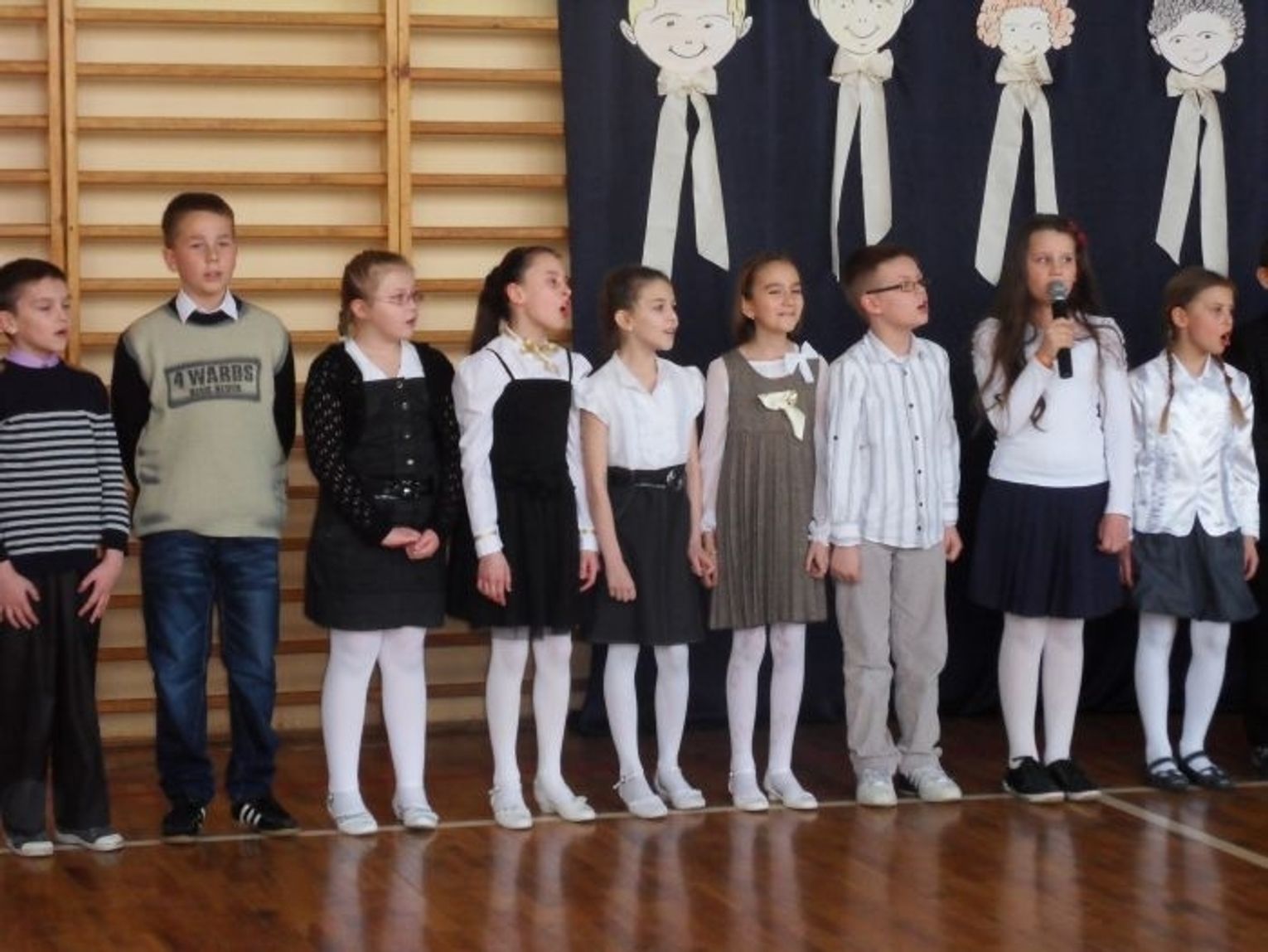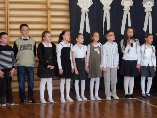 - Przygotowaliśmy dla Państwa krótki program artystyczny w wykonaniu niektórych asów z naszej szkoły - oznajmiła prowadząca imprezę Natalia Gardzielewska, uczennica klasy VI. - Zobaczymy tańce z przyborem gimnastycznym w wykonaniu uczestników szkolnego koła tanecznego, wysłuchamy utworów muzycznych zaprezentowanych przez uczniów z klasy IV oraz wierszy laureatów szkolnego konkursu recytatorskiego. Na początek zapraszamy do pokazu ze wstążką oraz wysłuchania utworów muzycznych rodzeństwa Doroty i Macieja Liców z klasy IV - na keybordzie zagrają oni „Odę do radości” oraz angielską melodię „Mary”.