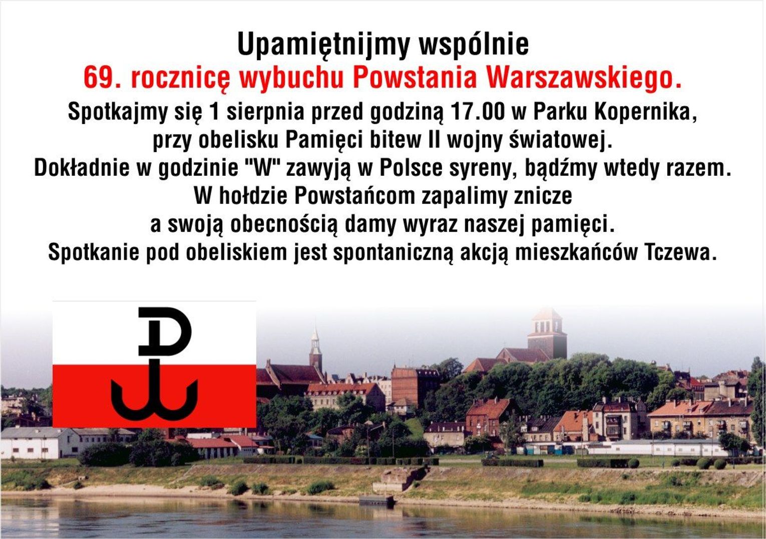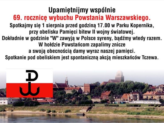 W hołdzie Powstańcom Warszawskim 1 sierpnia, o godz. 17 stanie w milczeniu i zadumie cała Polska. W tej ciszy zawyją syreny. W Tczewie patrioci spotkają się w Parku Kopernika, przy obelisku Pamięci bitew II wojny światowej.