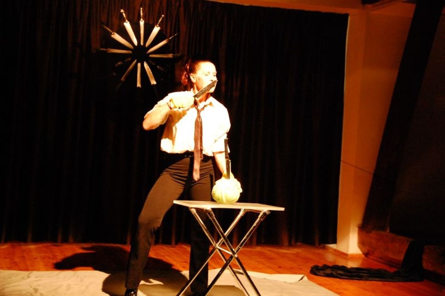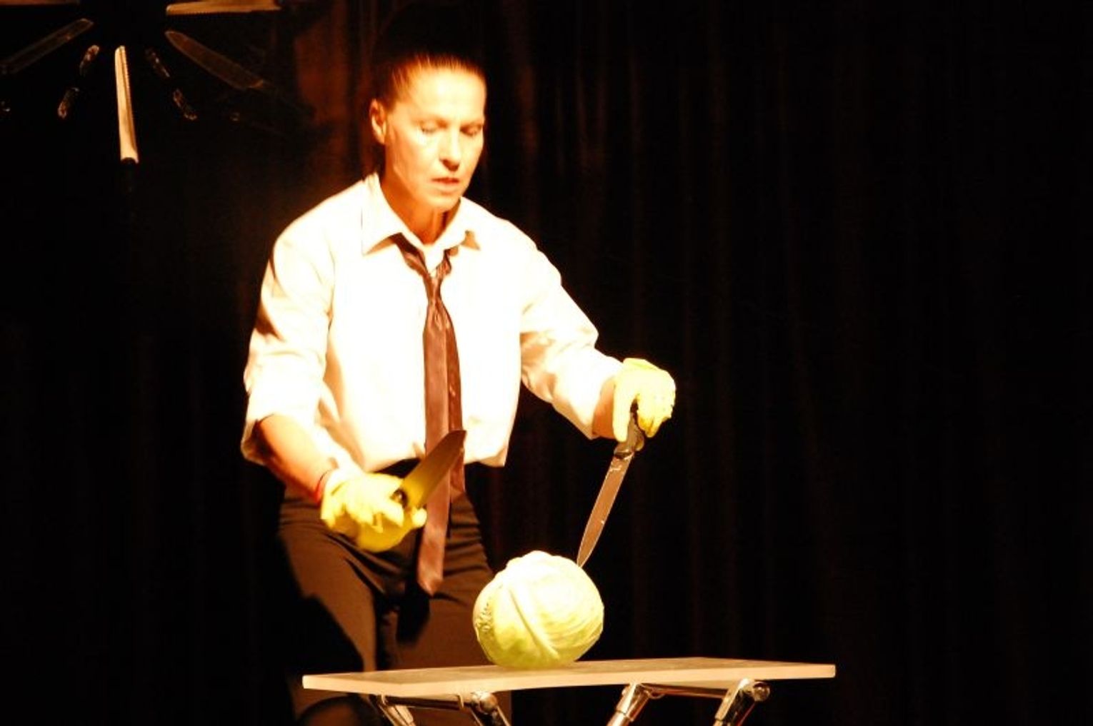 Wątek, który pokazywała publiczności Lidia Danylczuk dotyczył rozterek moralnych tuż po popełnieniu morderstw króla Ryszarda III, które przeradzają się w szaleństwo nad dokonaną zbrodnią. Aktorka wkracza na scenę z dużym worem, pełnym głów... kapusty. Przekaz jest jednak jasny, główki kapusty są w rzeczywistości głowami wrogów. Dalej w sztuce bohaterka tańczy z nożami, które są promieniami słońca w scenografii, po czym brutalnie i szaleńczo sieka główki kapusty. Mimo, że była to kapusta widok był makabryczny. Aktorka była cała w kapuście, a na sali czuć było zapach od tej siekanki. (Na przedstawieniu były dzieci (! ). Całe szatkowanie odbywało się przy przyciemnionej scenie, rozświetlonej jedynie półmrocznym, czerwonym światłem przy groźnych dźwiękach muzyki.