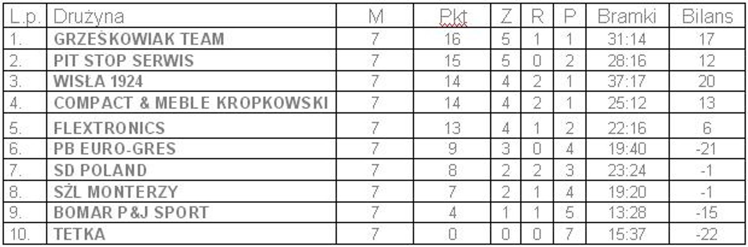 2 bramki - Łukasz Olszewski (SŻL Monterzy), Szlija Sławomir (Pit Stop Serwis), Krzysztof Fenske (Bomar P&J Sport), Piotr Włoch (TeTka), Maciej Chrzanowski (SŻL Monterzy), Jacek Kołodziej (Compact & Meble Kropkowski), Łukasz Milewski (Pit Stop Serwis), Damian Kleinschmidt (Compact & Meble Kropkowski), Erwin Kaczmarczyk (SD Poland), Krzysztof Kuliński (TeTka), Tomasz Gabrychowski (TeTka), Bartosz Langowski (Compact & Meble Kropkowski), Patryk Bielski (SD Poland);