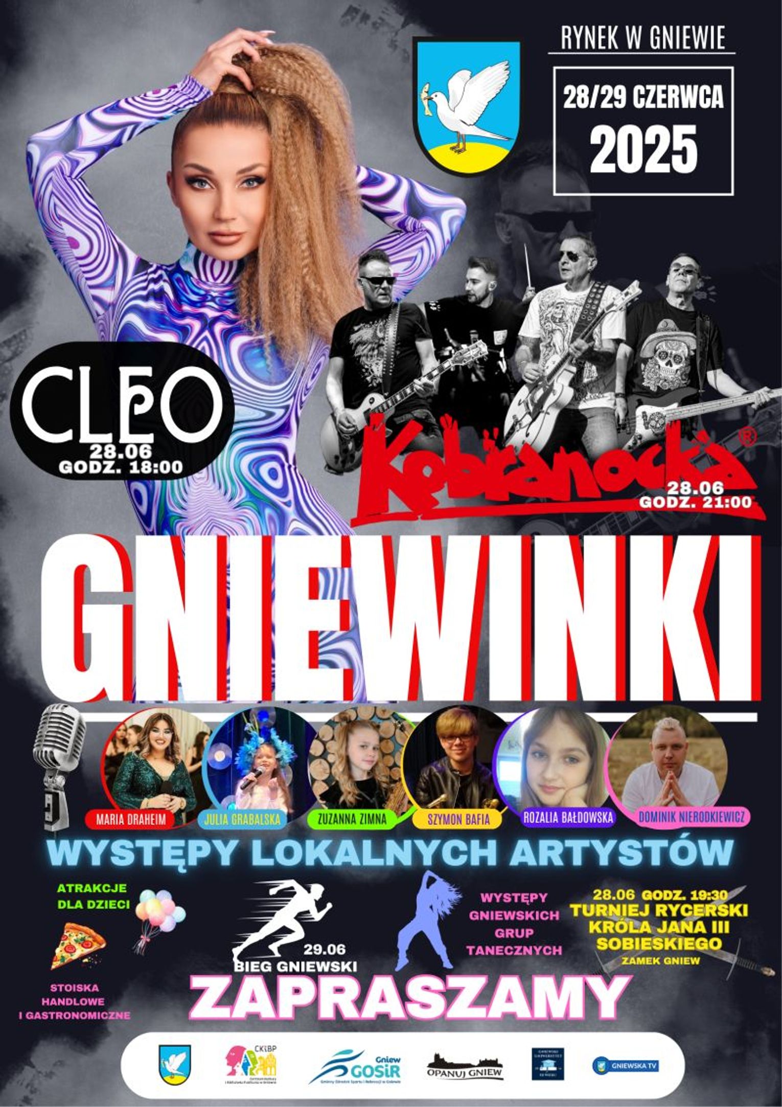 O godz. 18.00 dla gniewskiej publiczności wystąpi artystka polskiej muzyki – CLEO. Jej kariera rozpoczęła się w chórze gospel, a rozkwitła dzięki współpracy z Donatanem od 2013 r. Międzynarodową rozpoznawalność zdobyła dzięki przebojowi „My Słowianie” na Eurowizji 2014. Cleo wydała pięć solowych albumów, które przyniosły jej liczne diamentowe i platynowe płyty. Jest laureatką prestiżowych nagród, takich jak Superjedynki i Eska Music Awards. Była także trenerem w czwartej edycji programu The Voice Kids. Podczas koncertu wykona swoje największe hity m.in.: „My Słowianie”, „Za krokiem krok”, „Łowcy gwiazd” czy „Zabiorę nas”.